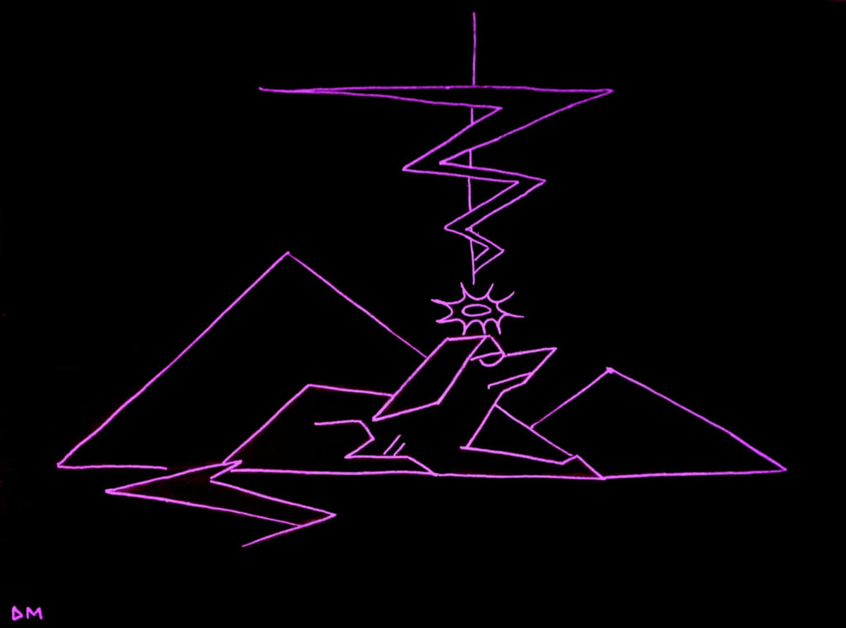 Weirdo alienDrawn on black paper in pencil, then pink posca marker. Myself in Ryan and canine form, laying down by the Egyptian pyramids as a statue. Alien lights beam from the sky into my head, giving me life. It represents the magic, wonder and strangeness of consciousness. I drew this while visiting my interstate friend, as a tattoo design concept for him!